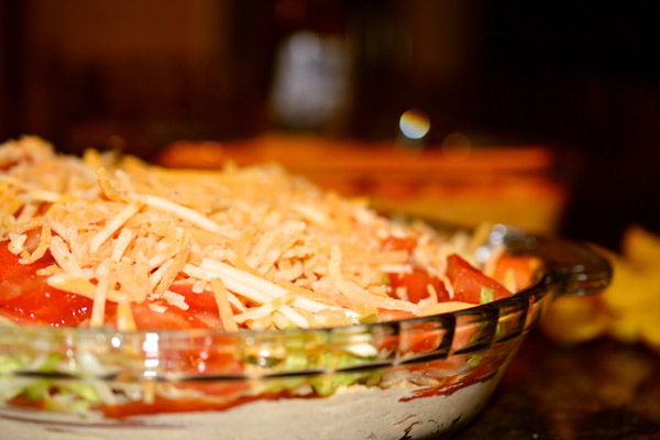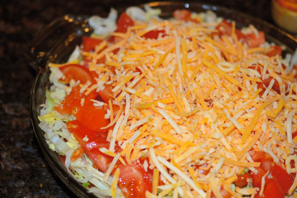 - Layer the lettuce, tomatoes and shredded cheese.