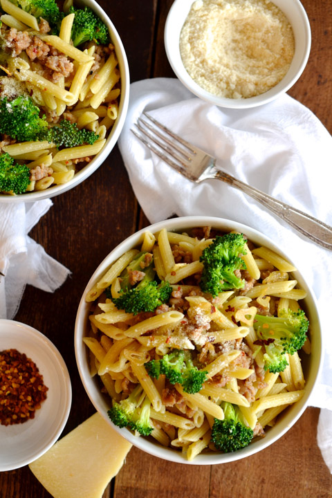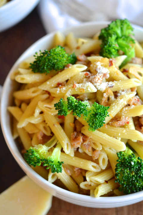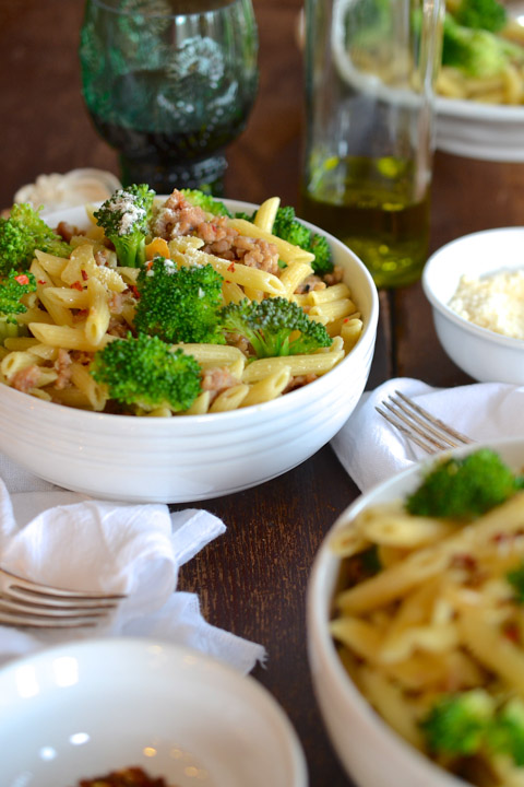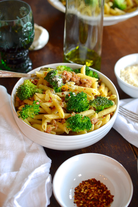 This dish is all about cooking the pasta to a perfect al dente; the sausage to a perfect crisp; the garlic to a caramelly, sweet softness (garlic tip: keep a very close watch – it can go from perfect to burnt in the same amount of time it takes our puppy to get from her pillow to the fridge when she hears the crinkle of an American cheese wrapper – no time, at all…), and the broccoli steamed to a perfect crunch.